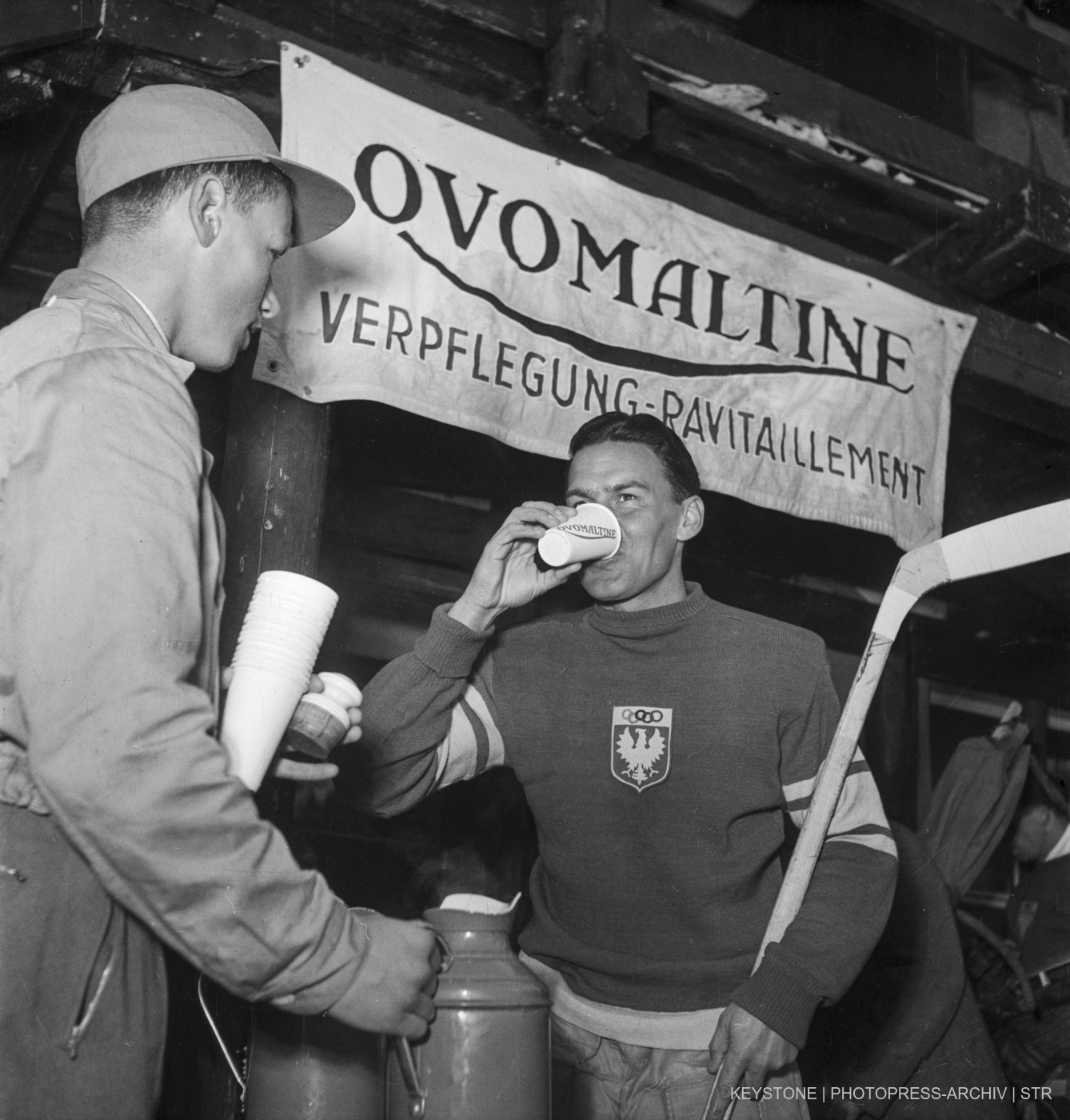 Pour que les Jeux olympiques d’hiver 2038 puissent avoir lieu en Suisse, l’association Switzerland 2038 dépend de sponsors privés, comme ce fut le cas en 1948 à Saint-Moritz, lorsque des marques telles qu’Ovomaltine ont soutenu les Jeux. (KEYSTONE/Photopress-Archiv / Str)